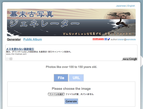 画像を江戸〜明治期に撮影されたような質感の古写真風画像に変換してくれるジェネレーターです。カラー写真、イラストでも、経年劣化したようなかすれ感、哀愁漂うセピア色の絶妙な風合いに変換してくれます。 もちろん、Photoshopなどを使って、同様の画像を作ることは可能ですし、細かい設定もできませんが、ほんの1、2秒で変換してくれますので、とても便利で利用価値のあるツールです。