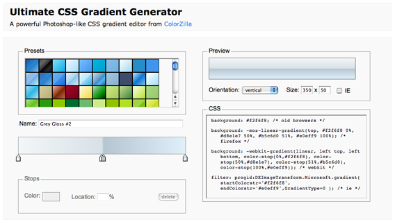 画像を使わず、それでいてグラデーション表現したい…そんなときに便利なグラデーション作成ジェネレーター。あらかじめ、Photoshopのスタイルのようなグラデーションが132個用意されていて、プレビューを見ながら簡単に作成できます。特にPhotoshopを使っている人なら、似たインターフェースなので、戸惑うことがありません。