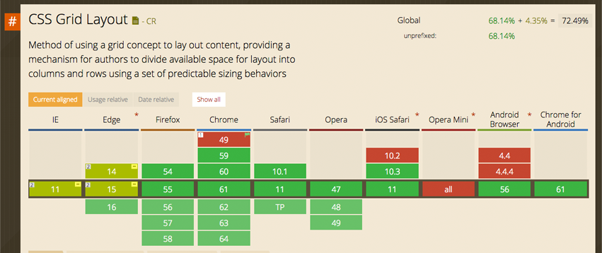 gridレイアウトはまだ策定途中(草案)ですが、モダンブラウザのほぼすべてが対応しています(Internet ExplorerやEdgeはベンダープレフィックスが必要。関連ページへのリンクは次の図の下にあります)。次の図は2017年9月27日のブラウザ対応状況です。ただし、古いブラウザを使用するユーザを多く抱える業界ではまだまだ不向きかもしれません。